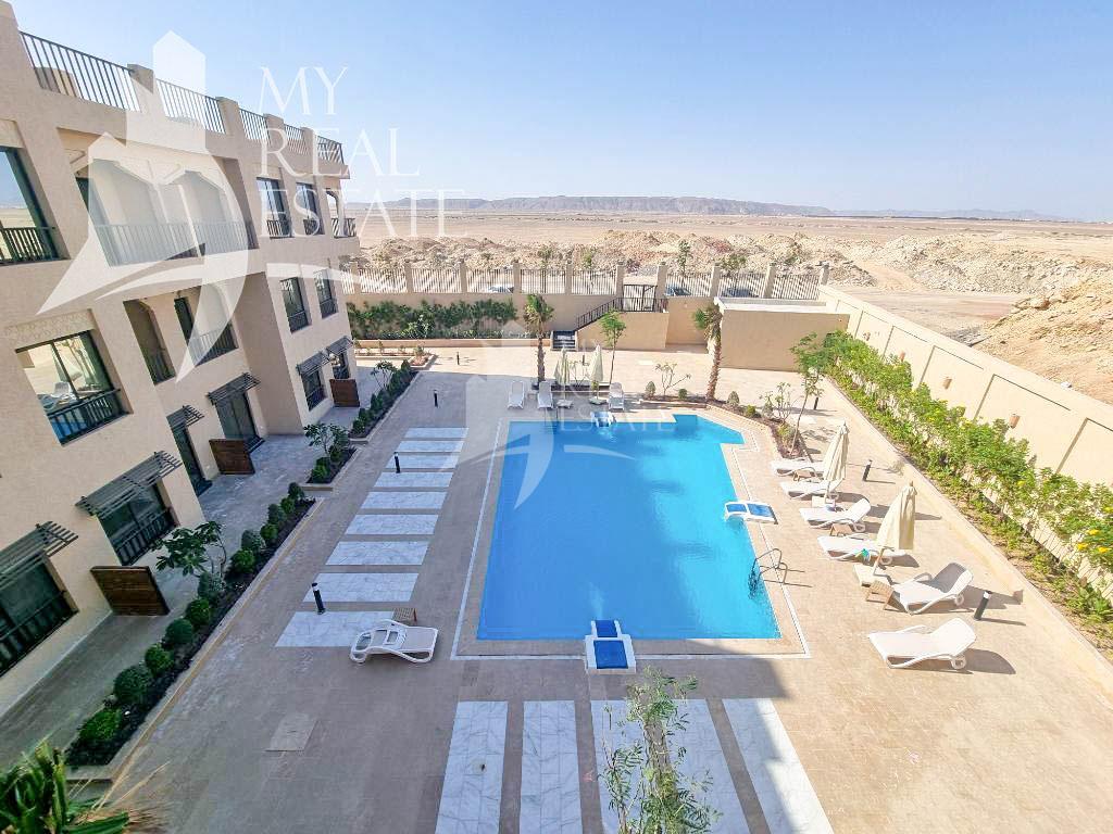 Almaza Suites is located in a peaceful and scenic setting, ideal for those who value tranquility and relaxation. Situated near our Aqua projects and just a short distance from El Gouna, this development offers stunning views of Hurghada’s majestic mountains. It also features a swimming pool for residents and select apartments with private gardens, adding an extra touch of luxury and outdoor living.